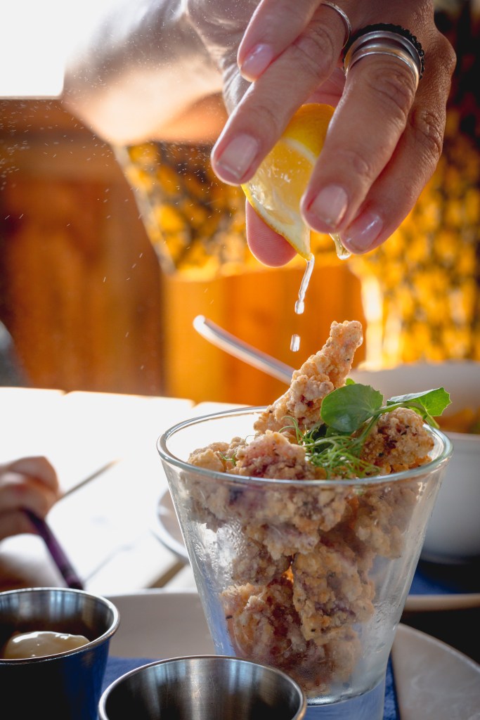 In complete contrast, our other starter was a bold and gusty Spanish style octopus, chorizo and potato stew. One mouthful and I’m whisked off to the sunny shores of Costa Maresme. It tastes deep and complex, lifted with the sprightliness of vinegar. A generous portion of deep fried baby squid comes shortly afterwards; light and crisp, with a pool of oyster mayonnaise.